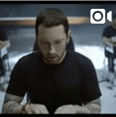 Eminem in un’espressione intelligente. Col mullet? No, non lo farebbe mai, è lo schienale della sedia